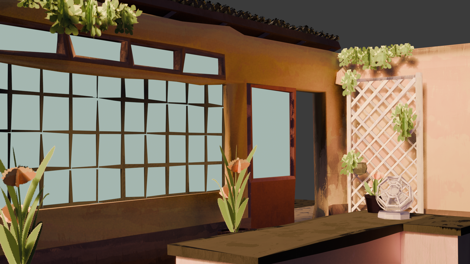 After we decided to use a 3D unlit background, our team's art director revised the concept art because my original version had too much contrast for a cozy game and included too many foreground elements that could distract from the user interface. The art director then provided me with the final concept to use as a reference for modeling the game assets.